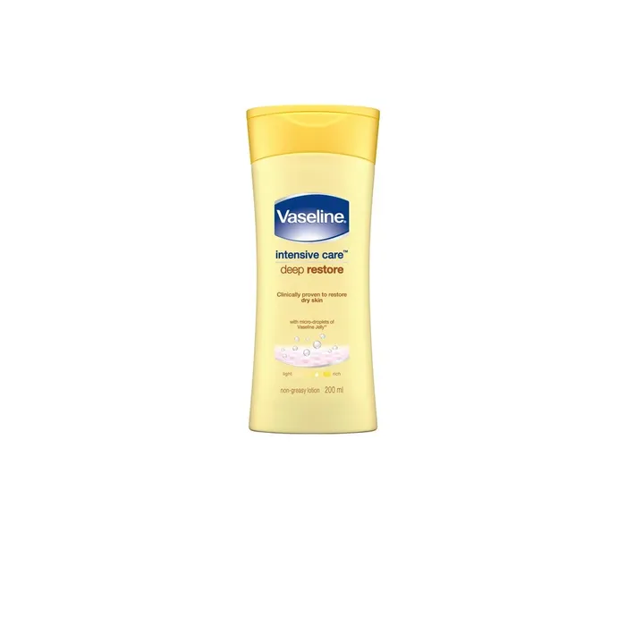 Kesesuaian Produk : Cocok untuk jenis kulit normal, kering, ataupun kasar. Vaseline percaya bahwa kulit yang sehat dimulai dari kelembaban dari dalam yang memperbaiki. Vaseline® Intensive Care™ Deep Restore yang diperkaya micro droplets dari Vaseline Jelly merupakan formula yang cepat meresap dan tidak lengket. Hasilnya adalah lotion yang mengurangi ketidaknyamanan akibat kulit kering dan iritasi, serta membuat kulit terasa lembab dari dalam* dan tetap sehat. Pelembab Vaseline ini juga sangat aman digunakan untuk kulit anda yang sensitif karena Vaseline Intensive Care Deep Restore Hand and Body Lotion menggunakan bahan-bahan pilihan berkualitas yang sudah teruji klinis. Cara Pemakaian Produk : Tuangkan lotion secukupnya lalu usapkan secara merata pada kaki dan tangan dan bagian tubuh lain yang anda inginkan. Untuk hasil maksimal gunakan 2 kali sehari (pagi & malam). Kandungan Produk: Water Mineral oil Stasric acid Dimethicone Glycerine Cyclopentasiloxane Triethanolamine Stearamide AMP Glycol Stearate Glyceryl stearate Phenoxyethanol Cetyl alcohol Magnesium aluminium silicate Perfume Carborner Methylparaben Prophylparaben Disodium EDTA Dihydroxypropyltrimonium chloride Hydroxyethyl urea Propylene glycol Lactic acid Avena sativa oat Straw extractPentasodium pentetate Sodium benzoate Potassium Sorbate