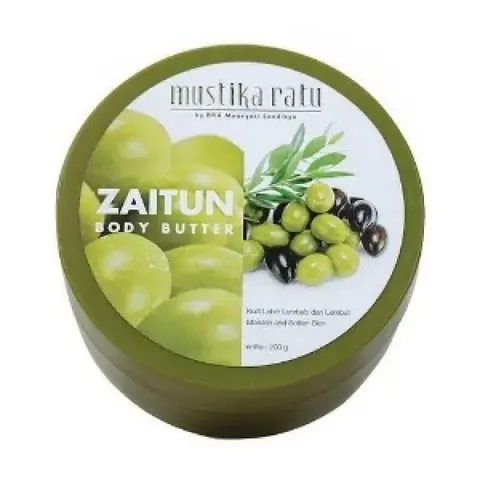 Merupakan cream yang mengandung bahan-bahan alami yang aman. Tidak lengket dan cepat menyerap ke dalam lapisan kulit sehingga kulit terasa lembut dan ternutrisi. Melindungi kulit dari paparan tabir surya di siang hari serta membantu menghilangkan selulit. Formula Zaitun Body Butter Mustika Ratu yang mengandung minyak zaitun sebagai pelembab alami kulit tubuh, untuk melembabkan kulit yang kering atau sangat kering, serta mengaja kelembutan kulit. Cara pakai : Usapkan butter ke seluruh tubuh sehabis mandi atau tiap kali diperlukanNo reviews found