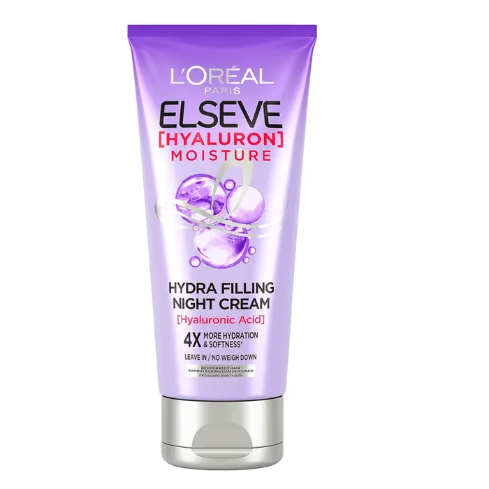 Untuk rambut kering dengan Hyaluronic Acid 72 jam mengunci hidrasi di rambut PERAWATAN RAMBUT MALAM HARI DENGAN HYALURONIC ACID PERTAMA*. Dapatkan perawatan rambut yang intensif di malam hari dengan formula yang diperkaya dengan Hyaluronic Acid, seketika menghidrasi rambut dan mengunci kelembapannya selama Anda tertidur tanpa membuatnya lepek. Rasakan sensasi rambut lebih lembut, mudah diatur dan tidak kusut ketika Anda bangun di pagi hari. 4x lebih melembapkan rambut** RAHASIA DIBALIK KRIM MALAM YANG MELEMBAPKAN DENGAN OVERNIGHT TECHNOLOGY Gesekan rambut dengan bantal selama Anda tertidur dapat menyebabkan rambut kusut dan cenderung kering. L’Oreal Paris telah mengembangkan overnight technology yang dapat melindungi permukaan rambut dari pergesekan dengan bantal, sehingga rambut tidak kusut dan lebih mudah ditata di pagi hari. 4X LEBIH MELEMBAPKAN DAN MELEMBUTKAN**. CARA PENGGUNAAN: Gunakan pada bagian tengah ke ujung batang rambut sebelum Anda tidur, diamkan selama semalam. Opsional, dapat dibilas keesokan harinya INGREDIENTS : 1239845 A - INGREDIENTS/BAHAN-BAHAN AQUA / WATER,CETEARYL ALCOHOL, AMODIMETHICONE, CETYL ESTERS, SODIUM BENZOATE, SODIUM HYALURONATE, BEHENTRIMONIUM CHLORIDE,TRIDECETH-6, CHLORHEXIDINE DIGLUCONATE, LIMONENE, ISOPROPYL ALCOHOL, CITRIC ACID, CETRIMONIUM CHLORIDE, COUMARIN, PARFUM / FRAGRANCE. (FIL: T286532/2).