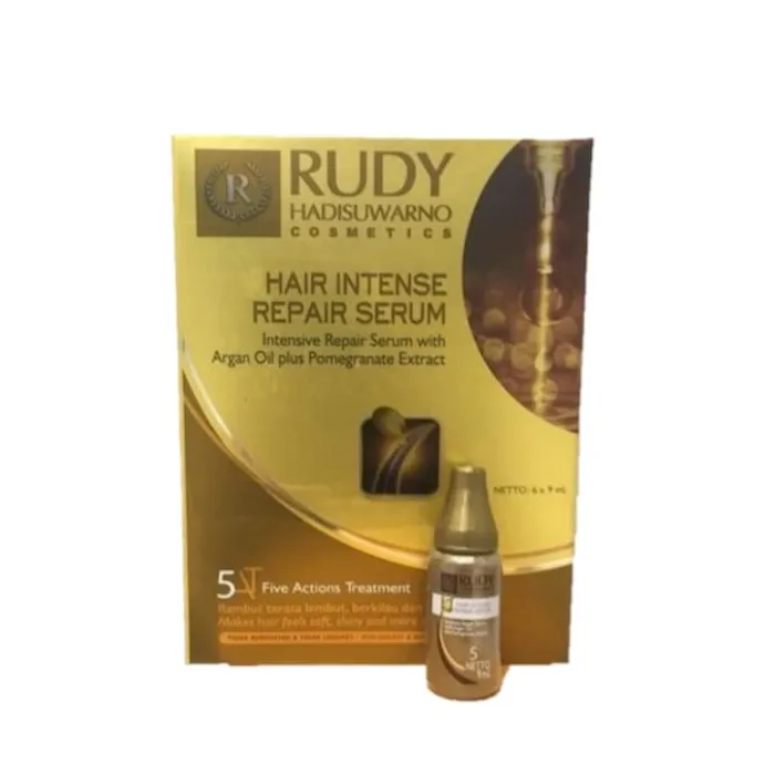 Intensive Repair Serum with Argan Oil plus Pomegranate Extract. Memperkenalkan Inovasi terbaru dari Rudy Hadisuwarno Cosmetics Hair Intense Repair Serum yang mengkombinasikan 2 bahan aktif untuk membantu mengatasi masalah rambut rusak, dimana rambut terlihat kusam, kering, mudah patah dan sulit diatur. Serum perawatan intensif ini bekerja optimal melaluiFive Action Treatment (5AT) yaitu: