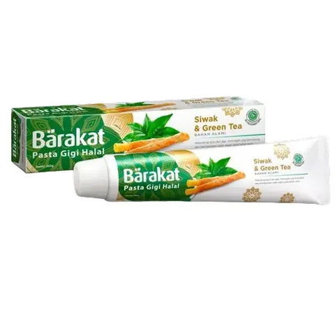 Hadir dengan inovasi baru, BARAKAT Pasta Gigi Siwak & Greentea dibuat khusus dengan kandungan alami Siwak + Green Tea yang dapat melindungi kesehatan gigi dan gusi, mencegah gigi berlubang, dan membuat nafas segar lebih tahan lama Cara Penggunaan: Gunakan pasta gigi BARAKAT Pasta Gigi Siwak & Greentea minimal 2X dalam 1 hari setelah makan untuk melindungi gigi dan gusi lebih sehat secara Alami. KEUNGGULAN: BARAKAT dibuat dari bahan alami yaitu Siwak yang dipercaya memiliki banyak manfaat untuk kesehatan gigi. Dikombinasikan dengan bahan alami lain yang juga memiliki manfaat baik , yaitu Siwak dan Green tea yang berfungsi: 1. Melindungi kesehatan gigi & gusi, 2. Mencegah gigi berlubang, 3. Membuat nafas segar lebih tahan lama.No reviews found