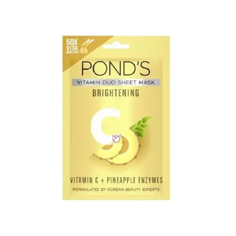 Pond's Vitamin Duo Sheet Mask menggabungkan dua kekuatan dari vitamin dan bahan natural untuk merawat kulit wajahmu. Kulitmu akan tampak lebih cerah dan glowing sejak pemakaian pertama! Vitamin C dikenal dapat membantu menekan produksi melanin untuk mencegah munculnya bintik hitam diwajah dan efektif mencerahkan wajah. Pineapple Enzymes merupakan enzim dari buah nanas yang dipercaya sebagai bahan untuk menyamarkan bintik hitam dan bekas jerawat.No reviews found