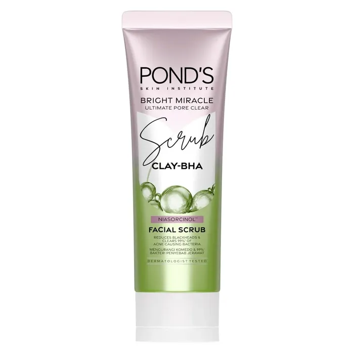 Memperkenalkan POND’s Bright Miracle Ultimate Pore Clear Facial Scrub 50G, inovasi terbaru dari POND’S SKIN INSTITUTE yang dirancang khusus untuk memberikan solusi bagi masalah komedo dan jerawat. Dengan formula CLAY-BHA yang unik, scrub ini mampu mengontrol produksi minyak berlebih dan mengangkat kotoran di dalam pori-pori dengan lembut, memberikan Anda kulit yang bersih dan segar. Kandungan NIASORCINOLTM, gabungan dari Niacinamide dan E-Resorcinol, memberikan kekuatan mencerahkan hingga 10 kali lebih efektif dibandingkan dengan Kojic Acid, menjadikan kulit Anda tampak lebih cerah dan merona. Scrub wajah ini juga telah terbukti secara klinis dapat membersihkan 99% bakteri penyebab jerawat, sehingga Anda dapat merasakan keajaiban kulit yang lebih cerah dan bebas dari masalah komedo serta jerawat. Diformulasikan dengan bahan-bahan berkualitas seperti Myristic Acid, Glycerin, dan Kaolin, produk ini menjanjikan perawatan yang optimal untuk kulit Anda. Rasakan sensasi kulit yang lebih halus, lembut, dan tampak lebih muda dengan penggunaan rutin. • Pembersih kulit wajah untuk membersihkan pori-pori secara mendalam untuk kulit cerah, mulus, dan bebas minyak berlebih • Mengandung NiasorcinolTM kombinasi sempurna dari Niacinamide, E-Resorcinol, dan Vitamin C dilengkapi dengan CLAY-BHA • Mengontrol produksi minyak berlebih dan mengangkat kotoran dalam pori-pori • Membersihan 99% bakteri penyebab jerawat dan mengurangi komedo • Untuk memberikan kulit cerah dan bebas dari komedo dan masalah jerawat • NIASORCINOLTM - formulasi gabungan dari Niacinamide & E-Resorcinol untuk 10x ekstra kekuatan mencerahkan BARU! POND's Bright Miracle Ultimate Pore Clear Facial Scrub, scrub lembut antibakteri yang mengangkat komedo & mengurangi masalah jerawat† Sekarang diformulasikan dengan kombinasi kandungan efektif dari POND'S SKIN INSTITUTE. CLAY-BHA: Mengontrol produksi minyak berlebih dan membantu mengangkat kotoran di dalam pori-pori. Membersihkan 99% bakteri penyebab jerawat & mengurangi komedo. NIASORCINOLTM - formulasi gabungan dari Niacinamide & E-Resorcinol untuk 10x ekstra kekuatan mencerahkan^ Rasakan Keajaiban Kulit Lebih Cerah - Bebas dari masalah komedo dan jerawat† ''uji laboratorium †jerawat yang disebabkan oleh bakteri, berdasarkan uji klinis ^dibandingkan dengan Kojic Acid