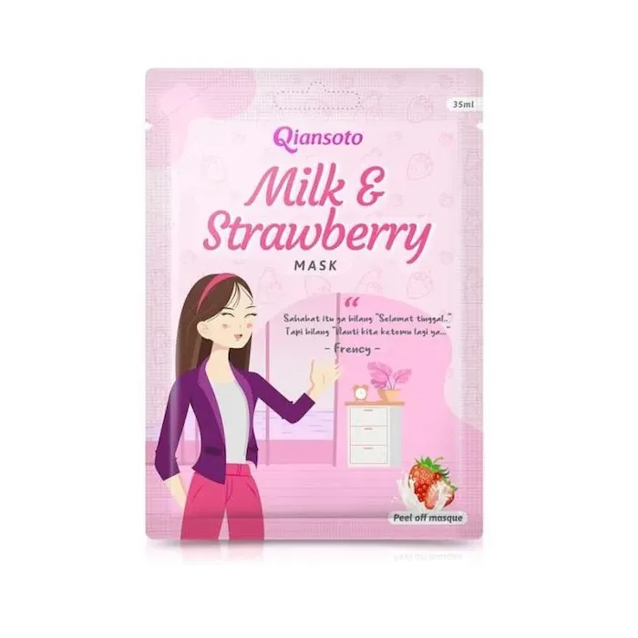 Qiansoto adalah brand kosmetik lokal yang didirikan sejak tahun 2017 Terdaftar di Badan Pengawas Obat Dan Makanan atau BPOM sehingga menjadikan produk dari Qiansoto banyak digunakan oleh berbagai kalangan usia terutama bagi para wanita usia muda yang sangat memperhatikan penampilan agar lebih terlihat cantik serta menarik perhatian. Qiansoto kini menghadirkan produk terbaru peel off mask atau masker lumpur yang sudah terdaftar di BPOM sehingga aman digunakan untuk kulit wajah. Qiansoto peel off mask mengandung ekstrak bahan alami sehingga masker wajah ini efektif untuk membersihkan kulit wajah secara menyeluruh. Qiansoto Hadir dalam beberapa seri varian terbaru masker wajah dengan kemasan praktis serta penggunaan yang mudah dapat langsung diaplikasikan pada kulit wajah tanpa harus mencampur apapun sehingga peel off mask Qiansoto milk and strawberry sangat praktis dalam penggunannya. Kandungan ekstrak strawberry dan vitamin E serta susu yang dapat merawat dan melembutkan serta melembabkan kulit wajah. Selain itu masker wajah milk and strawberry Qiansoto juga mengandung collagen yang membantu merawat kekencangan kulit wajah Cara Pemakaian : - Bersihkan wajah terlebih dahulu dengan air hangat lalu keringkan - Aplikasikan masker peel off qiansoto milk and strawberry keseluruh wajah secara merata - Tunggu hingga mengering atau sudah terasa kencang pada wajah, umumnya membutuhkan waktu 15 menit-20 menit - Angkat secara perlahan masker qiansoto peel off mask milk and strawberry yang sudah mulai mengering hingga tidak ada yang tersisa - Bersihkan wajah dari sisa-sisa pemakaian masker qiansoto peel off mask milk and strawberry dengan menggunakan tisu atau dapat juga bilas dengan air - Gunakan secara rutin masker qiansoto peel off mask milk and strawberry agar mendapatkan hasil yang efektif serta sesuai dengan harapan yang diinginkan untuk dapat memiliki wajah yang bersih, sehat dan glowing