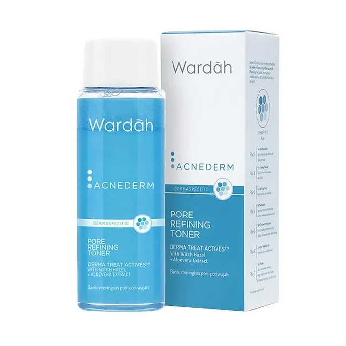 Merupakan toner multifungsi yang dapat bantu meringkas pori-pori kulit setelah membersihkan wajah. Hasilnya kulit akan lebih mudah menyerap manfaat krim pelembab yang akan digunakan. - Menenangkan - Menghambat bakteri penyebab jerawat - Melembapkan - Meringkas pori How to Use : 1. Tuangkan produk pada kapas 2. Usapkan keseluruh wajah yang sudah dibersihkan dengan Wardah Acnederm Pure Foaming Cleanser Gunakan rangkaian perawatan kulit wajah dengan dermaspesific plan yang aktif membantu melawan jerawat dan komedo agar tidak kembali lagi. 1. Acnederm Pore Blackhead Balm 2. Acnederm Pure Foaming Cleanser 3. Acnederm Pure Refining Toner 4. Acnederm Day Moisturizer 5. Acnederm Night Treatment Moisturizer 6. Acnederm Acne Spot Treatment Gel 7. Acnederm Face Powder Ingredients : Aqua, Propylene Glycol, Glycerin, Zinc Gluconate, Phenoxyethanol, Butylene Glycol, PEG-40 Hydrogenated Castor Oil, Trideceth-9, Aloe Vera (Leaf) Extract, Disodium EDTA, Ethylhexylglycerin, Fragrance, Menthyl Lactate, PPG-26-Buteth-26, Polysorbate 20, Hammamelis Virginiana (Witch Hazel) Extract, Potassium Sorbate, Sodium Benzoate.