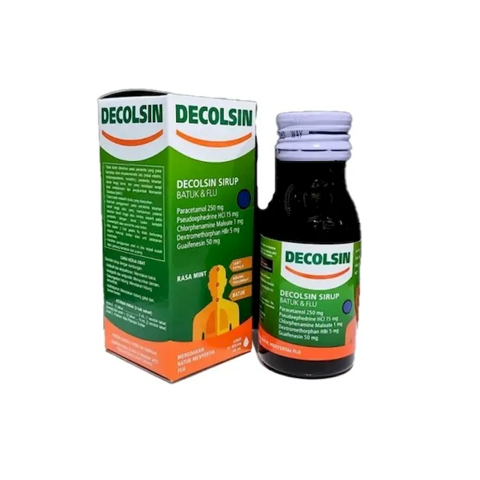 DECOLSIN SIRUP mengandung zat aktif Paracetamol, Guaiphenesin, Phenylpropanolamine, Pseudoephedrine HCL, Chlorpheniramine maleat, dan Dextromethorphan HBr. Decolsin sirup memliki cara kerja: - Antitusif dan ekspektoran: meredakan batuk. - Analgesik dan antipiretik: menurunkan demam. - Dekongestan hidung: meredakan hidung tersumbat. - Antihistamin: meredakan hidung gatal dan bersin-bersin.� Indikasi Umum Untuk meredakan batuk yang disertai gejala-gejala flu seperti demam, sakit kepala, hidung tersumbat dan bersin-bersin. Komposisi Per 5 mL: Paracetamol 250 mg, Pseudoephedrine HCL 15 mg, Chlorpheniramine maleate 1 mg, Dextromethorphan HBr 5 mg, Guaifenesin 50 mg Dosis Anak 6-12 tahun : 5 mL (1 sendok takar) Dewasa dan anak > 12 tahun : 10 mL (2 sendok takar) Anak 2-6 tahun: Atas petunjuk Dokter Aturan Pakai Sebelum atau sesudah makan Perhatian Hati-hati penggunaan pada penderita tekanan darah tinggi, atau stroke, seperti penderita dengan berat badan berlebih atau usia lanjut.Bila dalam 3 hari gejala flu tidak berkurang segera hubungi dokter. Hentikan penggunaan obat ini jika terjadi susah tidur, jantung berdebar dan pusing. Kontra Indikasi Hipertiroidisme, hipertensi, penyakit jantung; terapi MAOI; nefropati Efek Samping Gangguan GI, mengantuk, pusing; mulut kering, kesulitan miksi, berkeringat, nafsu makan berkurang; kejang epileptiformis (dosis besar) Manufaktur Darya Varia LaboratoriaNo reviews found