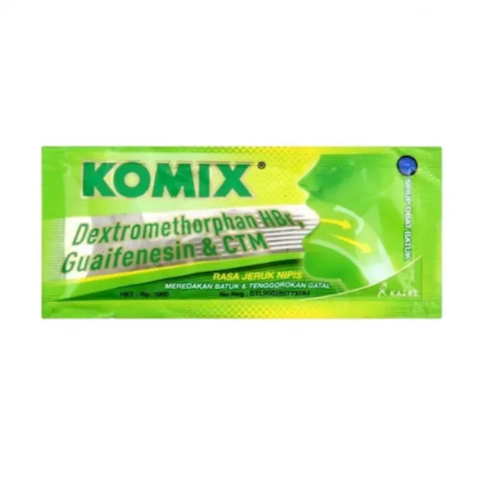 KOMIX JERUK NIPIS mengandung Guaifenesin, Dextromethorphan HBr, Chlorpheniramine maleate yang bekerja sebagai antihistamin, antitusif dan ekspektoran. Indikasi Umum Untuk meredakan batuk Komposisi Setiap sachet (7 ml) mengandung: Guaifenesin 100 mg, Dextromethorphan HBr 15 mg, Chlorpheniramine maleate 2 mg. Dosis Dewasa: 3 x sehari 1-2 sachet. Aturan Pakai Diberikan sesudah makan Perhatian Hati-hati penggunaan pada penderita dengan gangguan gungsi hati dan ginjal, glaukoma, hipertrofi prostat, hipertiroid, dan retensi urin. Tidak dianjurkan untuk anak < 6 tahun. Hati-hati penggunaan bersamaan dengan obat-obatan lain yang menekan susunan saraf pusat. Selama mengkonsumsi obat ini dilarang mengendarai motor dan menyalakan mesin Kontra Indikasi Hipersensitif terhadap salah satu komponen obat ini. Efek Samping Mengantuk, gangguan pencernaan, mulut kering, retensi urin Manufaktur Bintang Toedjoe