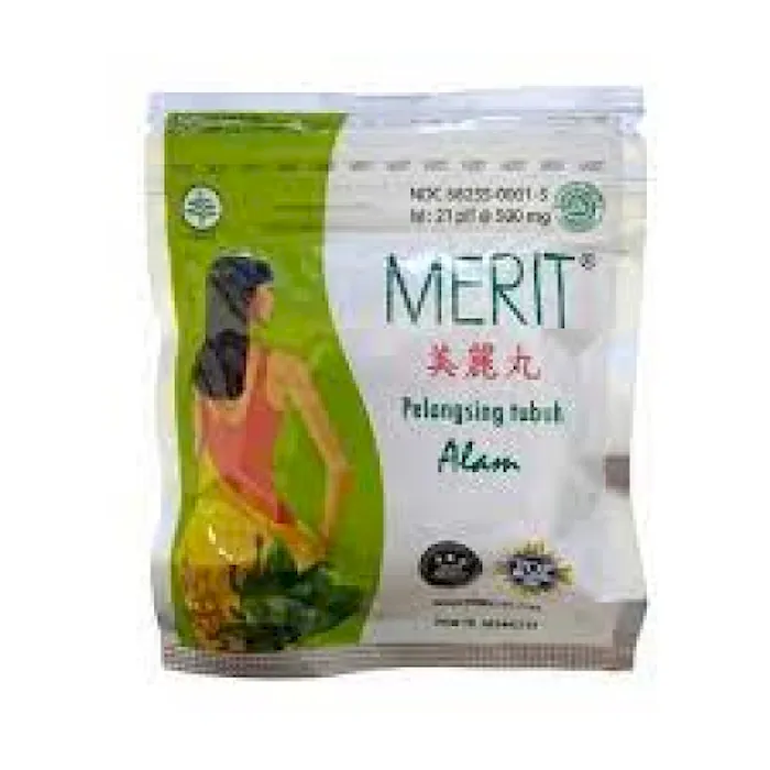 MERIT adalah tablet pelangsing tubuh yang diekstrak dari bahan-bahan alami (tumbuh-tumbuhan) tanpa tambahan bahan-bahan kimia, tidak menimbulkan efek samping apabila dikonsumsi dalam jangka pendek maupun jangka panjang. Dengan mengkonsumsi tablet MERIT secara teratur maka tidak perlu khawatir mengenai berat badan karena tablet MERIT siap membantu melarutkan lemak tubuh. Selain itu MERIT dapat mengurangi tingkat kolesterol dan trigliserida dalam darah (uji pre-klinik) Komposisi: Guazumae Folium 150 mg, Rhei Radix 50 mg, Granati Fructus Cortex 150 mg, dalam bentuk ekstrak dan bahan-bahan lainnya sampai 500 mg Indikasi / Manfaat / Kegunaan: Digunakan secara tradisional untuk membantu melangsingkan tubuh, Mengurangi lemak tubuh, Memperlancar BAB, Mengurangi tingkat kolesterol dan trigliserida dalam darah. Dosis: Sekali sehari @ 3 pill sebelum tidur malam bila diperlukan, boleh ditambah 3 pil diminum pagi hari. Untuk pemula, cukup minum 2 pil sekali sehari sebelum tidur malam. Perhatian: Tidak dianjurkan untuk wanita hamil atau penderita diare. Untuk mendapatkan hasil yang maksimal, dianjurkan diet rendah lemak dan kalori disertai dengan olahraga teraturNo reviews found