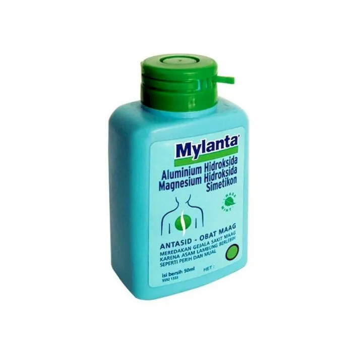Mylanta Liquid merupakan obat yang digunakan untuk mengatasi penyakit-penyakit yang disebabkan oleh kelebihan produksi asam lambung, seperti sakit maag dan tukak lambung. Setiap 5 ml Mylanta mengandung : 1. Magnesium Hidroksida berperan sebagai antasida untuk mengatasi tukak lambung dengan meningkatkan pH asam lambung melalui reaksi netralisasi. Senyawa ini juga memberikan perlindungan tambahan dari asam lambung dengan melapisi mukosa lambung menggunakan endapan koloid silika. 2. Aluminium Hidroksida (Al (OH)3) adalah zat yang bekerja sebagai antasida dengan bereaksi dengan asam berlebih di dalam lambung sehingga mengurangu gejala ulkus, mulas atau dyspepsia (maag). 3. Simetikon berfungsi dalam mengurangi kembung, ketidaknyamanan atau rasa sakit yang disebabkan oleh gas yang berlebihan dalam perut atau usus. Obat ini bekerja dengan menurunkan tegangan permukaan gelembung gas sehingga lebih mudah untuk dikeluarkan. Komposisi: Per 5 ml : Mg(OH)2 200 mg, Al(OH)3 200 mg, Simetikon 20 mg. Indikasi / Manfaat / Kegunaan: Refluks esofagitis, Rasa panas pada ulu hati, rasa tidak enak pada perut, gastritis, esofagitis peptikum, & hernia hiatus, kembung (gas), pemeriksaan endoskopik. Dosis: 3-4 x sehari 5-10 ml Penyajian: 1 atau 2 jam sebelum/sesudah makan Cara Penyimpanan: Simpan di tempat sejuk dan kering, terhindar dari sinar matahari langsung Perhatian: hipersentif, gangguan fungsi ginjal Efek Samping: mual, sembelit, diare, atau sakit kepala Pabrik: PT. INTEGRATED HEALTHCARE INDONESIA, JAKARTANo reviews found