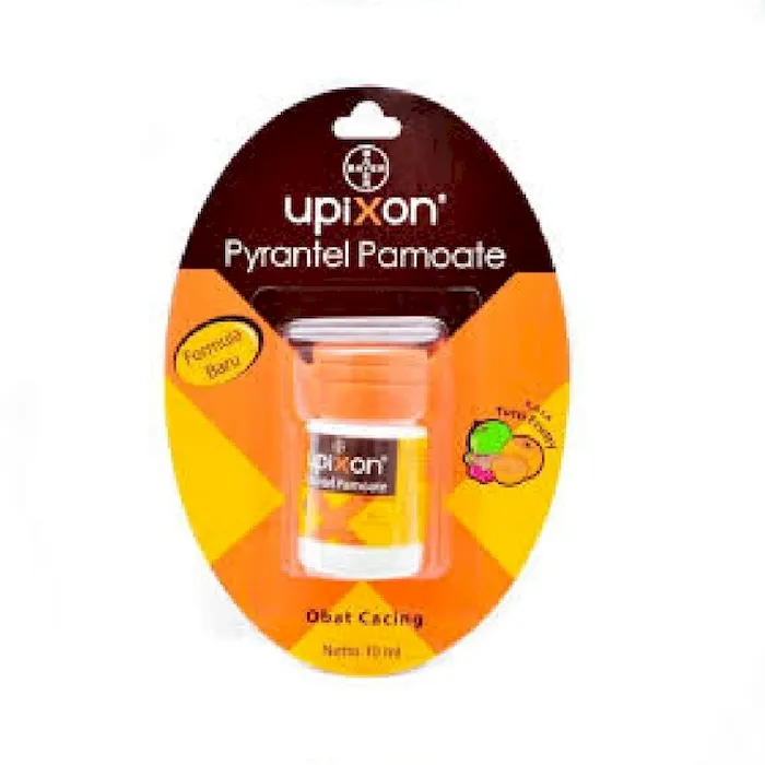 Merupakan sediaan obat cacing yang mengandung Pirantel Pamoat. Kandungan Pirantel bekerja dengan cara melawan cacing gelang (Ascaris), cacing benang (Enterobius), cacing tambang dan Trichostrongylus, Upixon tidak efektif melawan cacing cambuk. Upixon bertindak dengan melumpuhkan cacing yang terlepas dan di keluarkan oleh gerakan usus. Upixon tersedia dalam varian rasa Tutti Frutty yang disukai oleh anak-anak. Varian Upixon Suspensi Kandungan: Pirantel Pamoat 125 mg/ 5 ml Bentuk: Suspensi Farmasi: Bayer Indonesia Upixon Tablet Kandungan: Pirantel Pamoat 250 mg Bentuk: Tablet Kemasan: Blister @ 2 Tablet Farmasi: Bayer Indonesia Kegunaan Upixon digunakan untuk mengobati infeksi cacing usus, seperti: cacing kremi, cacing gelang, dan cacing tambang. Dosis & Cara Penggunaan Infeksi cacing tunggal atau campuran yang rentan: di berikan dosis 10 mg / kg berat badan sebagai dosis tunggal. Ascariasis: di berikan dosis 5 mg / kg berat badan sebagai dosis tunggal. Maksimal: 1 g / dosis. Pengobatan massal Ascariasis: di berikan dosis 2,5 mg / kg berat badan sebagai dosis tunggal diberikan 3-4 kali / tahun. Enterobiasis: di berikan dosis 10 mg / kg berat badan, diulang satu kali setelah 2-4 minggu. Maksimal: 1 g / dosis. Trichinosis: di berikan dosis 10 mg / kg berat badan / hari selama 5 hari. Efek Samping Efek samping yang mungkin terjadi selama penggunaan Upixon, seperti: mual, muntah, sakit kepala, gangguan penglihatan, dan inkoordinasi otot. Semua efek samping bersifat ringan dan akan hilang dengan menghentikan penggunaan. Perhatian Khusus: Penggunaan Upixon hindari anak dibawah usia 2 tahun dan wanita hamil. Pada gangguan fungsi hati hindari penggunaan Upixon.No reviews found
