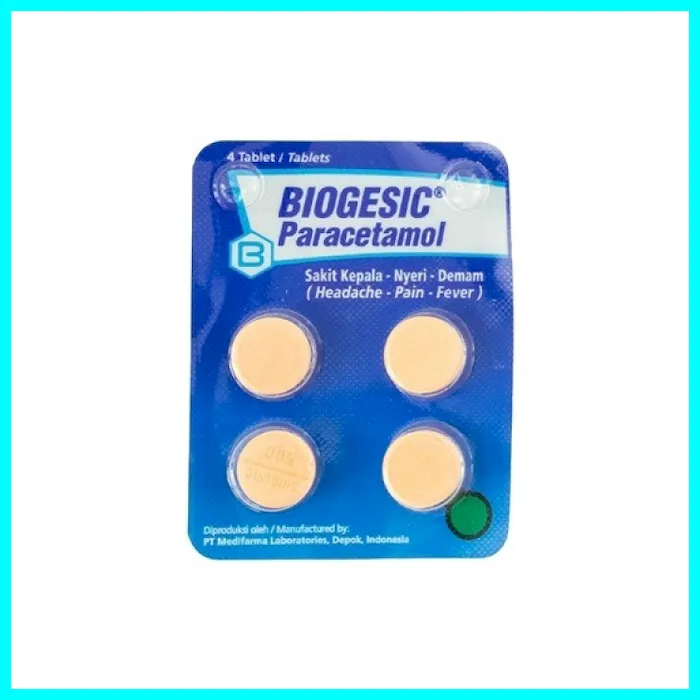 BIOGESIC merupakan obat dengan kandungan Paracetamol 500 mg. Obat ini dapat digunakan untuk meringankan rasa sakit pada sakit kepala, sakit gigi, dan menurunkan demam. Obat ini bekerja sebagai analgesik dengan meningkatkan ambang rangsangan sakit serta sebagai antipiretik yang diduga bekerja langsung pada pusat pengatur panas di hipotalamus. Indikasi Umum Meringankan rasa sakit pada sakit kepala, sakit gigi, dan menurunkan demam. Komposisi Paracetamol 500 mg Dosis Dewasa: 1 - 3 kaplet, 3 sampai 4 kali per hari. Anak (6 - 12 tahun): 0.5 - 1 kaplet, 3 sampai 4 kali per hari. Atau sesuai petunjuk dokter Aturan Pakai Obat dapat diminum sebelum atau sesudah makan Perhatian Hati-hati penggunaan pada pasien dengan penyakit ginjal. Bila setelah 2 hari demam tidak menurun atau setelah 5 hari nyeri tidak menghilang segera hubungi unit pelayanan kesehatan. Kontra Indikasi Jangan diberikan kepada penderita hipersensitif/alergi terhadap Paracetamol. Penderita gangguan fungsi hati berat. Efek Samping Pemakaian obat umumnya memiliki efek samping tertentu dan sesuai dengan masing-masing individu. Jika terjadi efek samping yang berlebih dan berbahaya, harap konsultasikan kepada tenaga medis. Efek samping yang mungkin terjadi dalam penggunaan obat adalah: penggunaan jangka panjang dan dosis besar dapat menyebabkan kerusakan hati dan rekasi hipersensitifitas Golongan Produk Obat Bebas (Hijau) Manufaktur Medifarma No. Registrasi BPOM: DBL8814702510A3