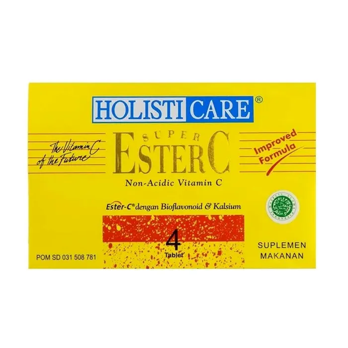 Merupakan suplemen yang mengandung Vitamin C dalam bentuk ester, sehingga lebih aman di lambung dan penyerapannya di dalam aliran darah menjadi lebih cepat, serta bertahan di dalam tubuh 2 kali lebih lama dibandingkan dengan vitamin C biasa (dalam bentuk Asam Askorbat). Suplemen ini digunakan sebagai Suplementasi vitamin C untuk membantu memelihara daya tahan tubuh. Indikasi Umum Suplementasi vitamin C untuk membantu memelihara daya tahan tubuh Komposisi Tiap tablet mengandung Ester-C 320 mg yang setara dengan vitamin C 247,36 mg, Calcium 27,33 mg, Citrus Bioflavonoid 100 mg. Dosis 1 - 3 tablet per hari. Aturan Pakai Sesudah makan, dapat bersama makanan untuk absorpsi yang lebih baik. Perhatian Simpan pada suhu di bawah 30 C dan kering, serta terlindung dari cahaya matahari langsung. Kontra Indikasi Hipersensitif terhadap komponen suplemen ini. Efek Samping Holisticare Ester C cenderung aman jika dikonsumsi sesuai aturan pakai atau anjuran dokter dan biasanya jarang terjadi. Namun, efek samping yang mungkin saja terjadi diantaranya: mual, muntah, diare, kram perut dan sakit maag. Manufaktur Indocare Citra Pasific