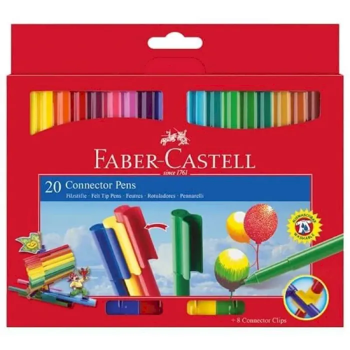 Ini dia spidol warna paling kreatif dan unik dari Faber-Castell, "Connector Pen". Connector pen memiliki warna yang cerah , aman untuk anak-anak dan tahan lama. Bentuk tutupnya yang unik membuatnya dapat disambung--sambungkan sehingga menjadi rapi dan tidak mudah menggelinding jatuh ke digunakan untuk menggambar dan mewarnai, Connector pen dapat digunakan untuk membuat craft kreatif. Connector Pen yang sudah habis tintanya jangan dibuang karena dapat dikumpulkan sebanyak-banyaknya agar dapat membuat craft yang lebih besar. Dapatkan segera dan bangun kreatifitas anak anda untuk merancang, menggambar dan membuat craft untuk 1 set/ 20 Connector Pens Silahkan di order kak...:)