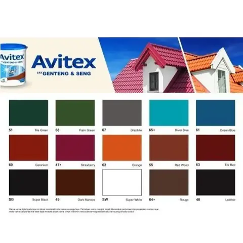 Avitex Cat Genteng dan Seng adalah produk dengan kualitas premium yang terbuat dari bahan akrilik dan pigmen khusus, mempunyai daya tutup yang baik dengan hasil gloss, serta diformulasikan untuk perubahan cuaca yang ekstrem. Sangat cocok digunakan untuk genteng yang terbuat dari tanah liat, beton, asbes, semen, seng, dan galvanis. Bisa juga diaplikasikan untuk marka jalan, lapangan olahraga, taman, dan permukaan eksterior lainnya. Aplikasi bisa menggunakan kuas, roll, maupun spray Tersedia dalam kemasan ukuran : 4 kg, dan 20 kg Fitur dan Kegunaan • Terbuat dari acrylic berkualitas • Daya tutup yang sangat baik sehingga sangat irit • Hasil akhir sangat mengkilap • Tahan terhadap segala cuaca • Daya rekat terbaik • Warna tidak mudah pudar • Tanpa merkuri dan timbal Pengencer: Air Bersih Hasil Akhir: Gloss (mengkilap) Daya Sebar: 10-12 m²/kg/lapis Waktu Pengeringan Kering Sentuh = 30 menit Kering Sempurna = 2 jam Jumlah Lapisan: 2 lapis Warna-warna digital pada layar ini dibuat mendekati kartu warna sesungguhnya. Perbedaan warna mungkin terjadi dikarenakan pebedaan dan pengaturan resolusi layar, maka warna yang Anda lihat tidak dapat menjadi acuan utama. Untuk referensi warna sebenarnya gunakan kartu warna yang tersedia di toko.