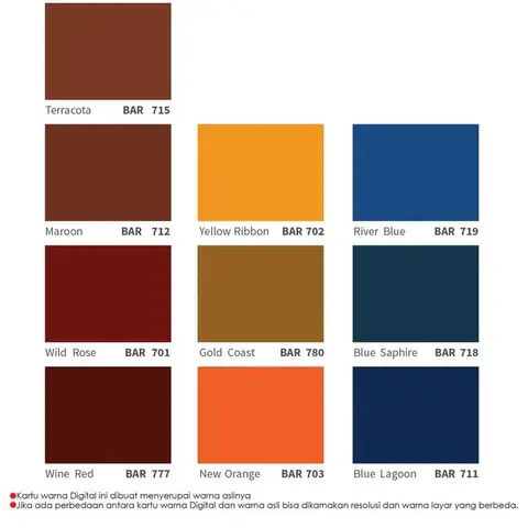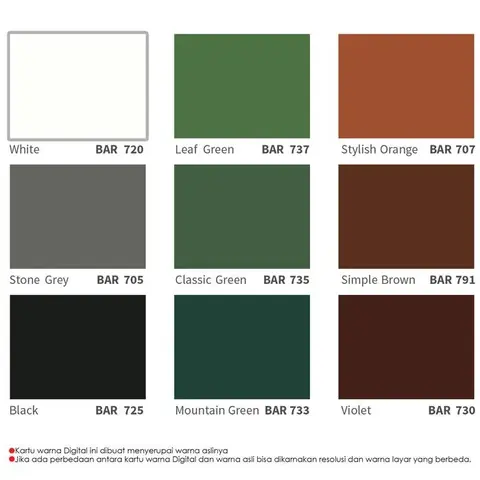 BITAROOF cat atap acrylic polymer berbahan dasar air. Siap digunakan pada genteng beton, tanah liat, sirap, marka jalan, pot bunga, dan taman. KEUNGGULAN : Sangat cocok untuk iklim tropis, berkualitas tinggi, semi gloss, tahan UV, tahan jamur dan udara lembab, serta mudah dibersihkan. CARA PENGGUNAAN : -Area genteng harus kering, bersih dari kotoran dan partikel yang dapat mengurangi daya rekat. -Pada genteng baru, harus berkadar air 15%. -Pada genteng lama, bersihkan dengan amplas. -Tambahkan BITAROOF dengan air bersih 10% dan aduk sebelum digunakan. -Dibutuhkan 2-3 kali pelapisan untuk hasil terbaik, dengan selang waktu antar lapis pengecatan minimal 30 menit. Aplikasi dapat menggunakan semprotan, kuas, atau roller.