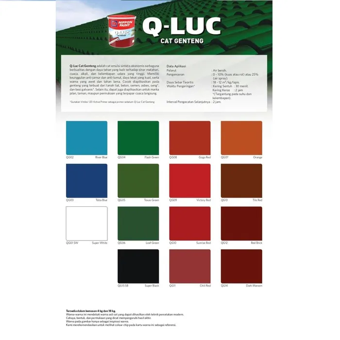 Adalah cat emulsi sintetis ekonomis serbaguna berkualitas dengan daya tahan yang baik terhadap sinar matahari, cuaca, alkali, dan kelembapan udara yang tinggi. Q-LUC CAT GENTENG Sangat cocok diaplikasikan pada genteng yang terbuat dari tanah liat, beton, semen, asbes, seng, dan besi galvanis. Selain itu, dapat juga diaplikasikan untuk marka jalan, taman, maupun permukaan yang terpapar cuaca langsung. KEUNGGULAN 1. Anti Jamur dan Lumut 2. Daya Tutup Baik 3. Daya Lekat Yang Kuat 4. Warna Awet dan Tahan Lama 5. Tampilan Akhir Semi-GlossNo reviews found