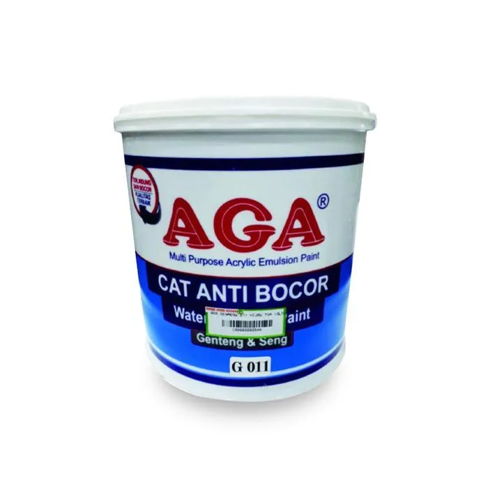 Adalah cat yang bermutu tinggi, diolah dari bahan pilihan terbaik, dirancang khusus untuk digunakan pada berbagai macam permukaan genteng, seng, asbes, lisplang kayu, dekorasi taman, tembok yang terkena air dll. Cat Genteng/Seng/Pelapis Anti Bocor AGA terbuat dari bahan Acrylic terbaik larutan air, bisa menghasilkan film yang sangat lentur dan tidak tembus air. Sangat cocok untuk cat tembok samping sebagai WATERPROOFING/PELAPIS ANTI BOCOR dan tahan lama. Untuk penggunaan sebagai WATERPROOFING/PELAPIS ANTI BOCOR, agar hasil lebih bagus dianjurkan aplikasi cat ini sebanyak 3 – 4 kali lapis. Masih ada beberapa kelebihan Cat Genteng/Seng/Pelapis Anti Bocor AGA yaitu dapat mencegah pertumbuhan jamur/lumut, mencegah kelembaban tembok, mencegah timbul flek-flek pada tembok, plafon triplek, eternit, dll Data Teknis – Penampilan Warna : Gloss – Daya Sebar : Lebih kurang 4 – 5 m2/kg (Untuk Genteng/seng) Lebih kurang 3 – 4 m2/kg (Pelapis anti bocor/Waterproofing) – Pengenceran : Air bersih 20 – 30% (Untuk Pelapis anti bocor/Waterproofing Maks 20%)