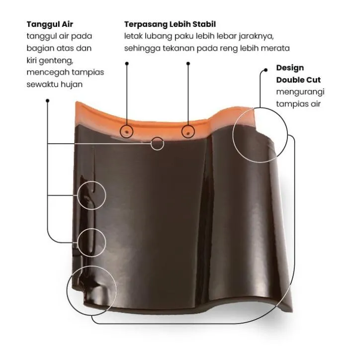 Kanmuri Estrongica Atap Genteng Keramik Tersedia warna Natural Panjang ±320 mm Panjang Efektif ±260 mm Lebar ±314 mm Lebar Efektif ±265 mm Berat Per...