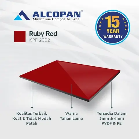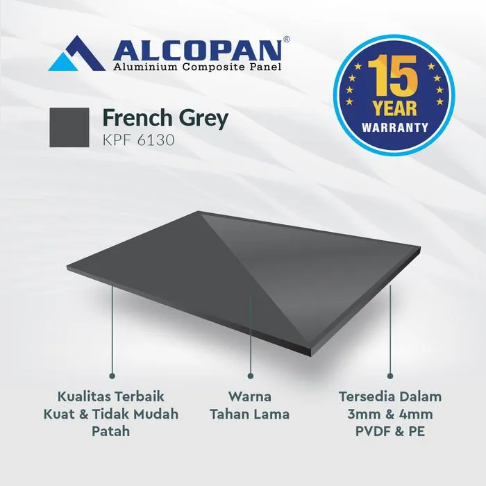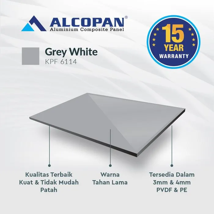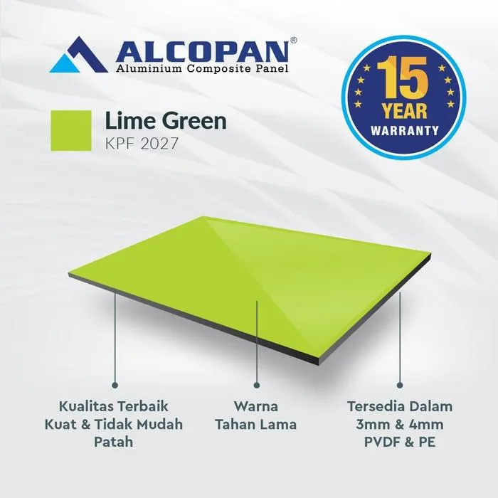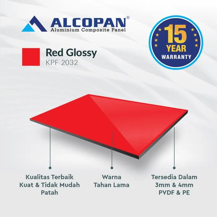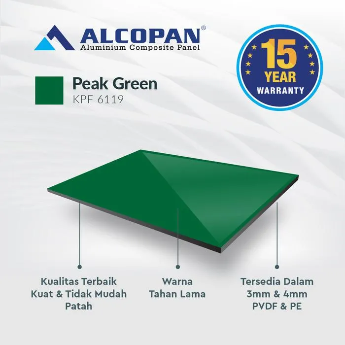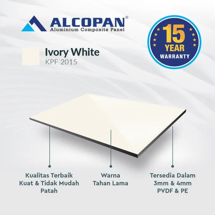 ALCOPAN ACP cocok diaplikasikan pada Kitchen Set, Pintu Aluminium, Gerobak, Booth, Billboard, Neon Box, Lemari Aluminium, Karoseri, dll. ALCOPAN memberikan Jaminan Pengiriman yang cepat serta Kualitas & Harga terbaik dikelasnya ALCOPAN adalah produk ACP (Aluminium Composite Panel) terbaik dikelasnya Keungulan ALCOPAN ACP : 1. Anti Rayap 2. Anti Karat 3. Varian Warna 4. Warna Tahan Lama 5. Kokoh PVDF = Exterior Tebal Material (mm) : 4 mm Ukuran : 1220x2440mm Tebal Skin Aluminum (mm) : 0,30 mm eksterior