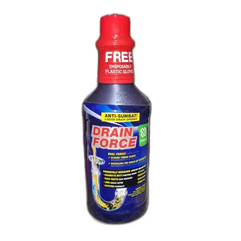 Obat mampet tanpa soda api Pembersih Pipa: Melancarkan pipa mampet & Melarutkan lemak dalam hitungan menit (pipe cleaner) Anti Sumbat Ampuh untuk Saluran Mampet, WC mampet (drain cleaner) Aman untuk sistem pipa plastik standar SNI AKSI GANDA : Melancarkan saluran pipa mampet sekaligus melarutkan lemak makanan dalam hitungan menit oleh efek Thermodynamic (panas) yang ditimbulkan sewaktu bercampur dengan air Bekerja sangat cepat, Hemat waktu & biaya DRAIN FORCE jauh lebih berat daripada air, formula ini akan langsung mengalir ke sumbatan dan segera bekerja Aman untuk semua sistem plastik perpipaan standar dan septic tank setelah dibilas air Mengandung anti-korosi Membersihkan kerak, lumut, serangga mati & bakteri penyebab bau di saluran CARA PEMAKAIAN: Gunakan sarung tangan & kacamata pelindung. Disarankan memakai masker untuk bau tidak sedap yang ditimbulkan akibat sampah sumbatan. UNTUK SALURAN TERSUMBAT TOTAL : Buang semua air tergenang di saluran. 1. Tuang ke saluran tersumbat sesuai takaran. 2. Diamkan selama 5 menit. ( 15 menit utk saluran tersumbat total). 3. Siram perlahan dengan air hingga saluran dipastikan lancar kembali. Jika saluran masih tersumbat, ulangi prosedur seperti di atas. IKUTI CARA PEMAKAIAN, dan TAKARAN yang ada di KEMASAN Drain Force Anti Sumbat pengganti soda api untuk WC, toilet, kamar mandi, dapur, pipa paralon mampet. #PEMBELIAN YANG DI SARANKAN WESTAFEL : 1 - 2 botol KLOSET : 2 - 3 botol KAMAR MANDI / PIPA LEKUK : 3 - 5 botol
