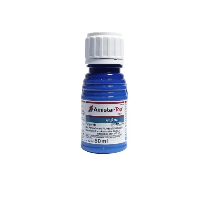 Kandungan : Azoksistrobin 200 g/l, Difenokonazol g/l Bentuk : pekatan cair berwarna kuning muda & mdh larut dlm air Cara Kerja : Sistemik Diproduksi : PT Syngenta Indonesia Fungisida Amistartop merupakan jenis fungisida sistemik utk mengendalikan penyakit tanaman yg disebabkan oleh jamur (fungi). Amistartop dpt mengendalikan penyakit jamur pd berbagai jenis tanaman, seperti bawang merah, cabai, jagung, kubis, kakao, kedelai, melon, padi, oyong, semangka, tomat dll Kelbhan & Kekrngan: Bekerja secara sistemik & mampu mengendalikan penyakit dlm jaringan tanaman Berbentuk cair dgn formulasi SC yg mdh larut dlm air, mdh digunakan & tdk menyumbat alat semprot Berspektrum luas dlm mengendalikan penykt jamur Tdk mdh tercuci air hujan Lbh ekonomis amp; menghemat biaya produksi krn dosis penggunaan rendah Meningkatkan pertumbuhan tanaman krn dilengkapi dgn zat pengatur tumbuh (ZPT) Meningkatkan kualitas hsl panen Mengandung 2 bahan aktif dr golongan amp; cara kerja yg berbeda sehingga lbh efektif dlm pengendalian penykt Harga Amistartop 325 SC relatif lbh mahal jika dibandingkan dgn fungisida sejenis Dosis dan Aplikasi : 1. Disemprotkan pd seluruh bagian tanaman, batang, daun dan buah 2. Dosis 0,5-1ml per 1 liter air (7,5-15ml per tangki semprot 15 ltr) 3. Interval penyemprotan setiap 1 minggu 1x 4. Waktu penyemprotan pagi hari setelah embun kering atau sore hariNo reviews found